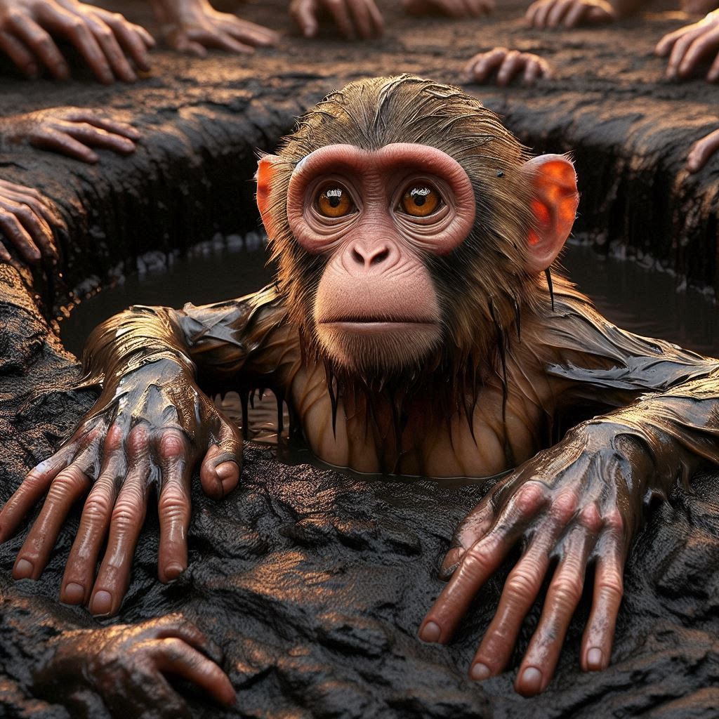 We’re stuck on feeling like a monkey stuck in a tar trap. They take a glob of tar and put it where a monkey will get its hand stuck in it and, in trying to pull free, the monkey gets its other hand, both feet, and finally its mouth stuck, too. Consider this: Whatever we do, we end up stuck right here at feeling and craving. We can’t separate them out. We can’t wash them off. If we don’t grow weary of craving, we’re like the monkey stuck in the glob of tar, getting ourselves more and more trapped all the time. So if we’re intent on freeing ourselves in the footsteps of the arahants, we have to pay attention specifically on feeling until we can succeed at freeing ourselves from it. Even with painful feelings, we have to practice—for if we’re afraid of pain and always try to change it to pleasure, we’ll end up even more ignorant than before.