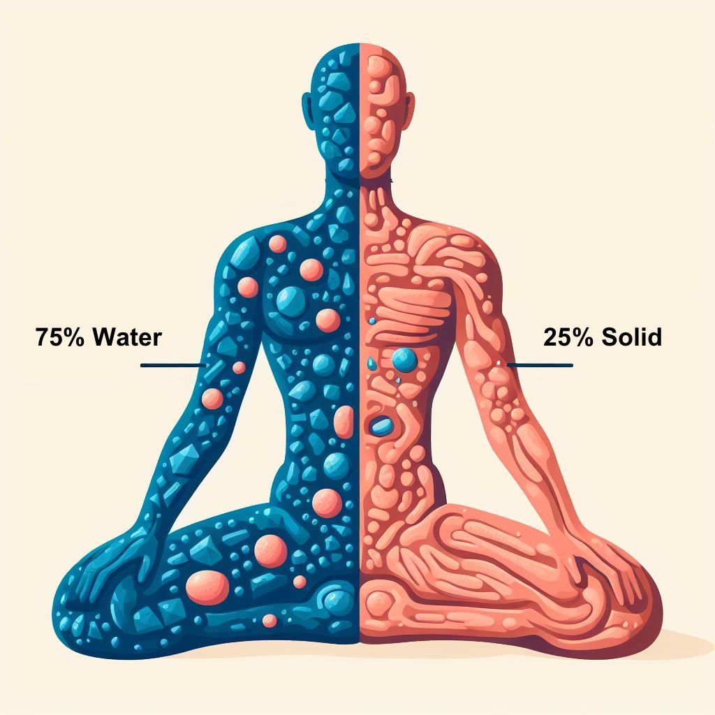 The body is composed of two types of substances: 25% solid matter and 75% water. Solid matter consists of proteins, lipids, carbohydrates, minerals, etc., forming hair, nails, teeth, skin, muscles, organs, and more. Liquid matter is water, present in bodily fluids like blood, tears, saliva, urine, sweat, and externally in rivers, lakes, clouds, rain, plant juices, etc. Both internal and external matter are fundamentally the same; they differ in form and configuration, continuously changing based on conditions.